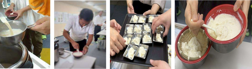 凝固剤(にがり・すましこ)の違いによる2種類のお豆腐の食べ比べに加えゆば入りや山いも入りのお豆腐の試食、豆乳の試飲も楽しみました。