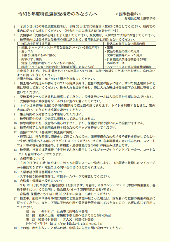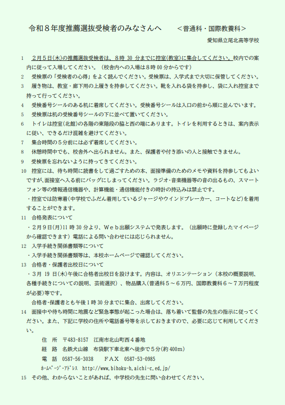 お知らせ/保護者の皆様へ/受験生の皆様へ/学校生活 令和8年度推薦選抜・特色選抜受検者のみなさんへ 2026年1月29日 令和8年度推薦選抜受検者のみなさんへ 令和8年度特色選抜受検者のみなさんへ 令和8年度推薦選抜受検者のみなさんへ 令和8年推薦選抜受検者のみなさんへ 令和8年度特色選抜受検者のみなさんへ 令和8年特色選抜受検者のみなさんへ